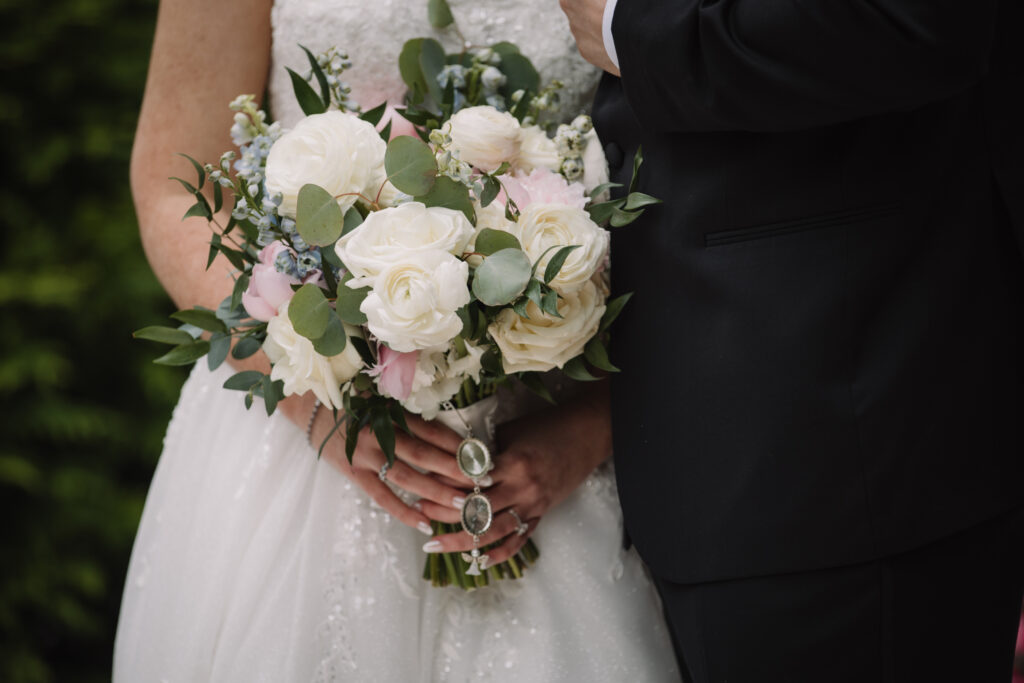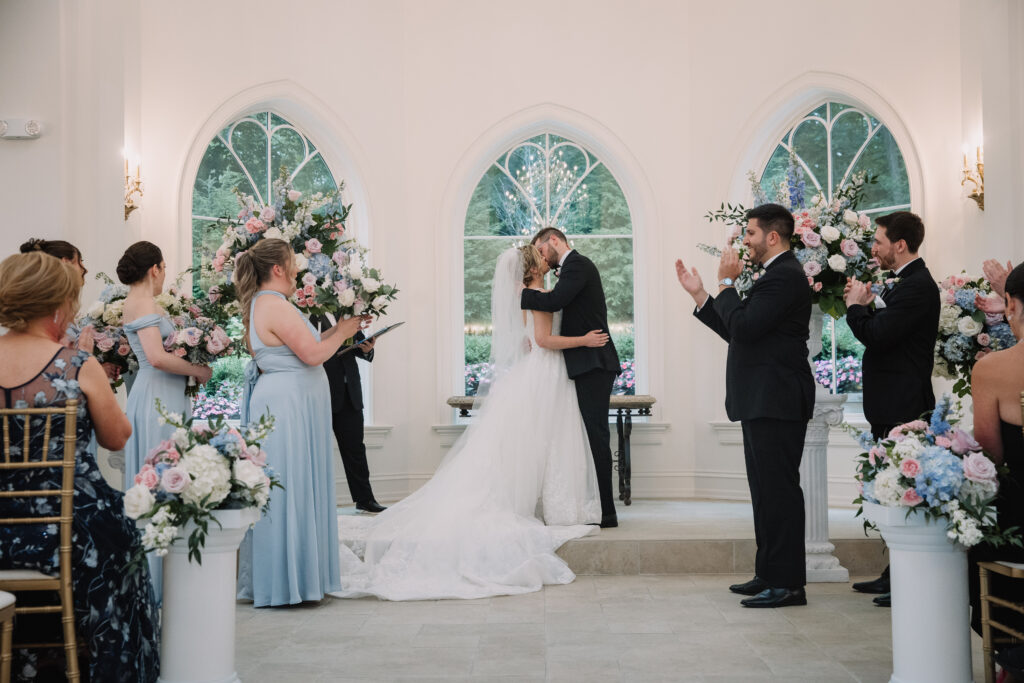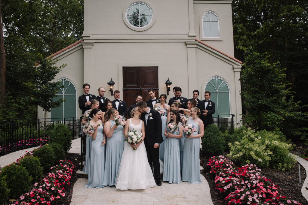 June in New Jersey gave them early summer florals in full bloom. The gardens at Nanina’s were lush, which made the pastel-forward color story feel natural within the landscape rather than decorative.
