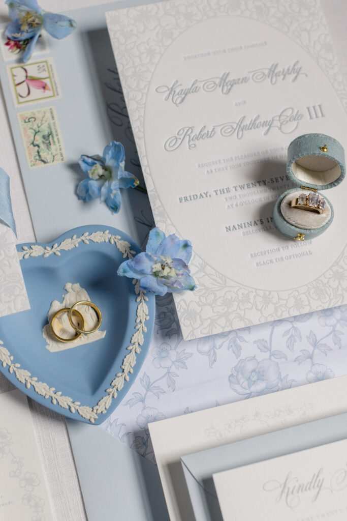 The focal point was a three-ink letterpress invitation card — a decision we made to fully commit to the floral-heavy aesthetic Kayla envisioned. Using three shades of blue created depth within the artwork while keeping the palette cohesive. The letterpress impression added a tactile quality that aligned with the elevated feel they were searching for.