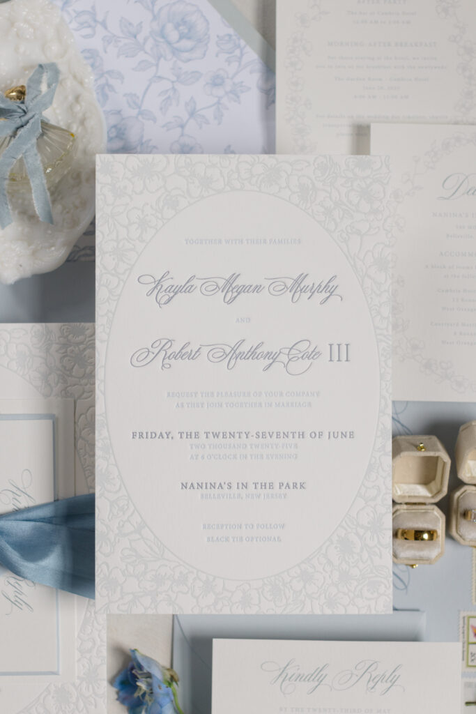 Kayla found me on Instagram while searching for a New Jersey stationer. After ordering samples from larger online retailers, she and her mom felt the paper and printing didn’t reflect the level of formality they were planning. They wanted weight. Texture. Intention. Something that felt considered from the moment guests opened the envelope.